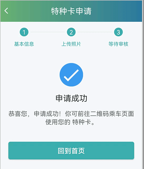 7、信息提交无误后,页面将显示“申请成功”。返回首页,再次点击“扫码乘车”,即可正常使用拥军卡乘车功能。