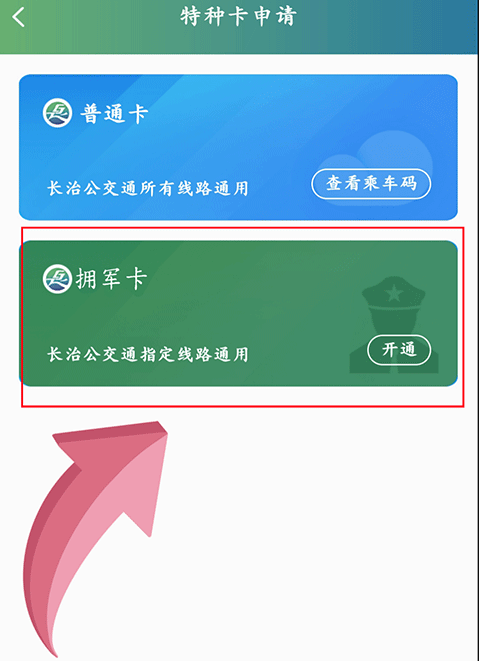4、在乘车码页面选择“拥军卡”开通选项;