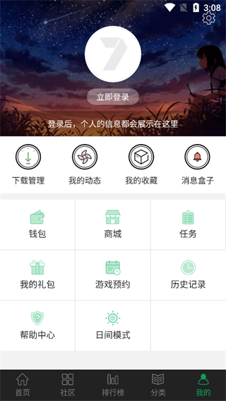 个人中心整合账户管理、下载记录、礼包领取、任务进度等功能。登录后可查看收藏、历史动态,并使用钱包、商城等增值服务,实现一站式个人操作。