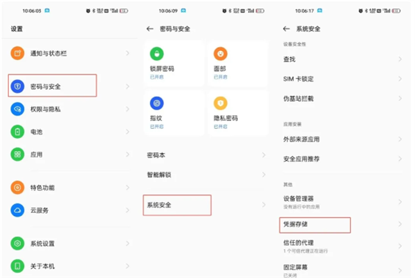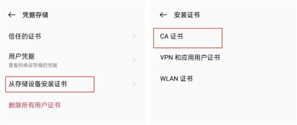 安装用户证书时,请前往手机系统设置,搜索“CA证书”或依次进入:密码与安全 → 系统安全 → 凭据存储 → 从存储设备安装 → CA证书,验证锁屏密码后选择导出的HttpCanary.pem文件完成安装。