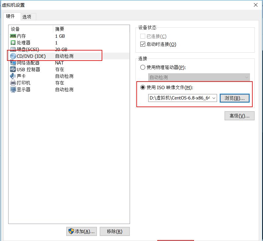 其次我们可以对处理器进行调整, 对硬盘大小也可以进行调整, 但是这里我们都选择默认就行了, 直接跳到 CD/DVD(IDE) 选项, 选择 我们下载的 CentOS 镜像文件, 然后点击确定