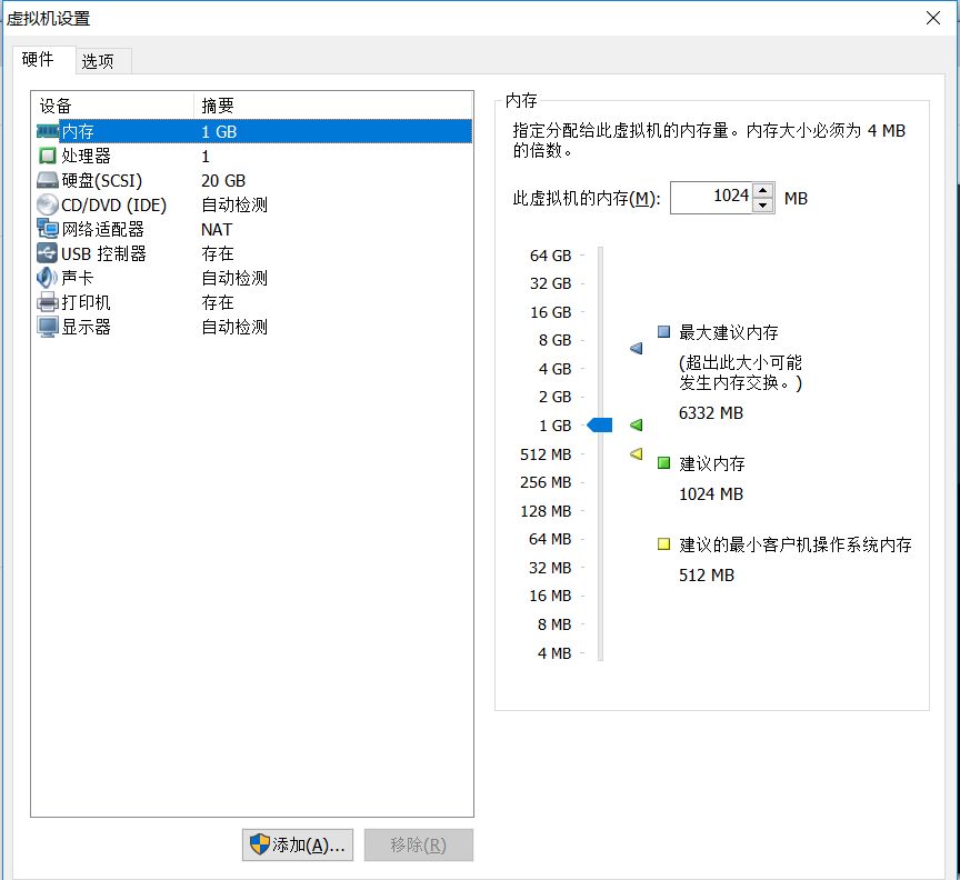 首先调整内存大小, 一般来讲, 内存最低不能小于 628 m, 最大不能超过 真实物理机内存的 一半。 我们可以默认选择 1024M内存大小就够了