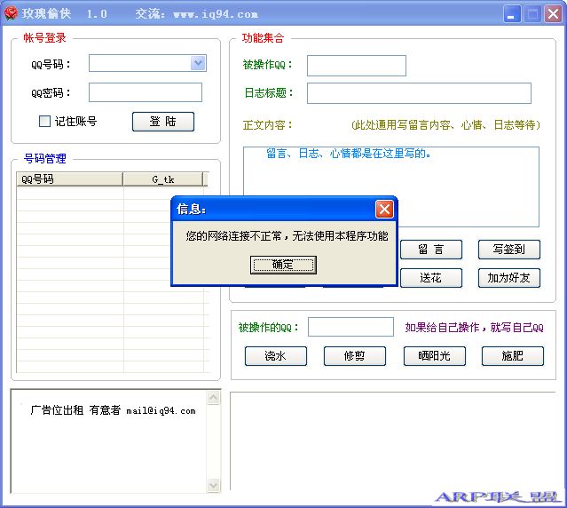 软件简介:1、多QQ帐号登陆、管理、(它是与CPU进行沟通的桥梁内存)占用小2、多QQ帐号发日志、写心情、写留言3、多QQ帐号送礼物、送花、加好友4、多QQ帐号花藤浇水、修剪。 晒太阳5、多QQ帐号花藤施肥,操作日志详细显示6、软件带签名,更新程序,自动在线升级 , 完整简介