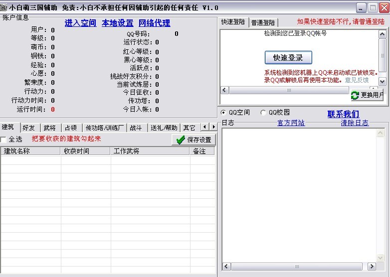 软件简介:1.自动领取建筑奖励,2自动派武将去工作,3,自动领取每日签到,4,自动派武将去校场练习,5.自动扫描好友,6,自动领取铸剑阁,7.自动领取传功塔,8.自动领取好友税收,9自动领取每日税收10.自动送礼等.