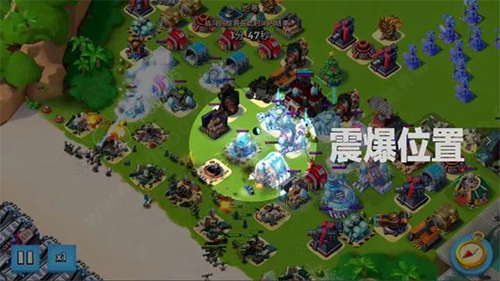 要解决护盾发生器,就必须震住大本周围的毁灭加农炮和震爆火箭炮。但震点太多能量不够,这里选择用震撼铁拳节省能量。