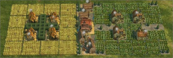 3、复合产业组合:服装工坊与果园采用1:1配比,共用1座一级仓库实现原料直供;