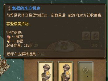 • 高级关税宝物获取:重点发展【研究院】岛屿(优选产枣地形),持续研究可产出稀有关税加成物品;在中立商队旅店、罗叔交易所等节点装备多件同类型关税宝物(推荐单岛配置3件),配合高频次低单价交易(如木头+枣子组合),可显著提升关税收益稳定性与总额。