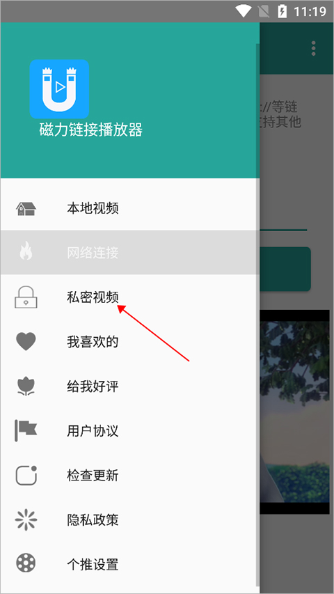 1、点击左上角扩展图标,进入菜单后选择【私密视频】;