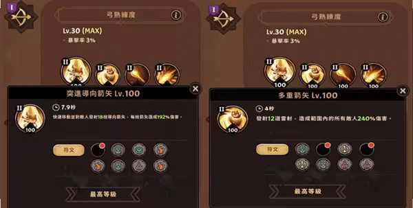 在开启8张卡片并激活二阶技能的前提下,弓系强度主要依赖于“突进导向箭矢”的质变。需注意:1、2、3技能的【增益符文】仅生效一个效果,不叠加,建议优先开启“多重箭矢CD-4秒”以实现常驻减CD。