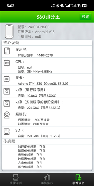 6. “硬件信息”页面详细列出设备的CPU型号、屏幕参数、存储规格及系统版本等关键配置,助你全面掌握手机真实硬件水平。