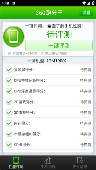 1. 打开360跑分王App后,主界面清晰划分三大功能模块:性能评测、手机排行与硬件信息,便于用户快速定位所需功能。