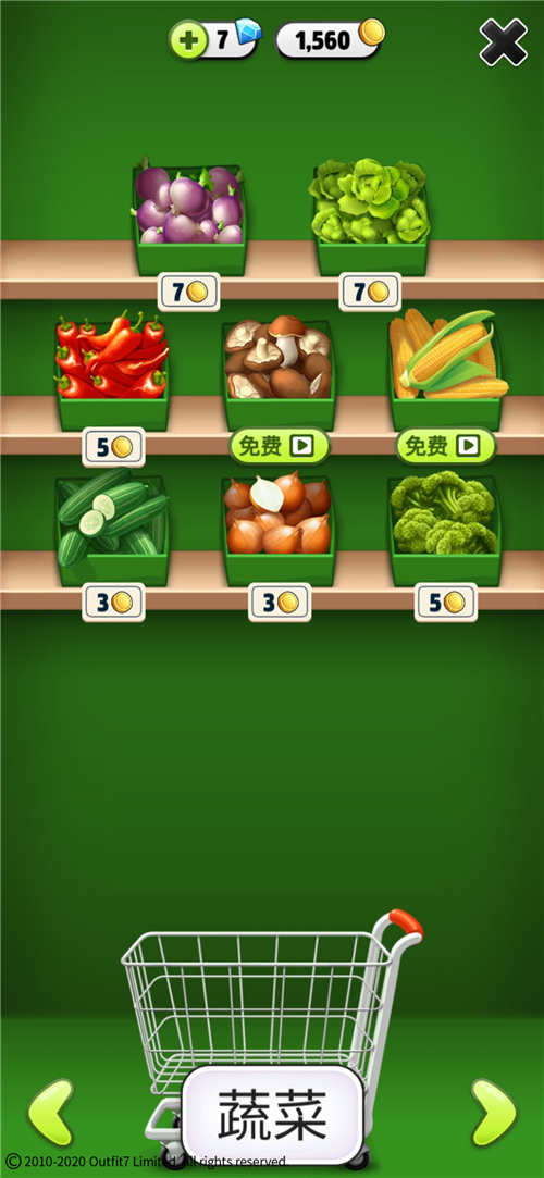 2. 进入商店后,你会看到八个货架,分别陈列不同种类的食物。部分货架需达到特定等级才能解锁。货架上的食物有的可通过观看视频免费领取,但大多数需要消耗金币购买。