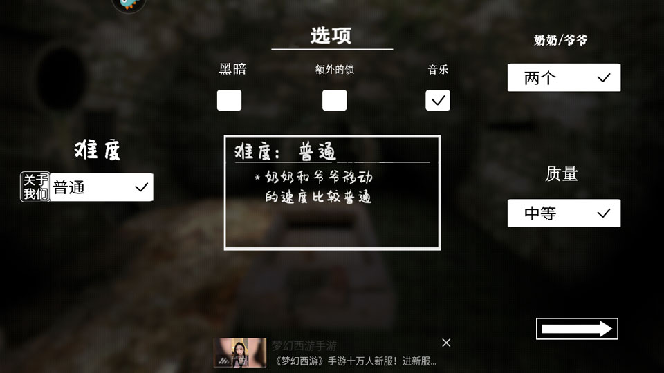 2、首次进入可自定义游戏设置,包括难度等级、画面质量,并选择敌人配置——仅奶奶、仅爷爷,或两者同时出现。