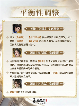 基于后台数据与玩家反馈,S11赛季将对刘炼、南宫锦、李寻欢三位英雄进行针对性调整,旨在提升对战公平性与玩法多样性,确保每位英雄都能在战场上发挥独特价值。