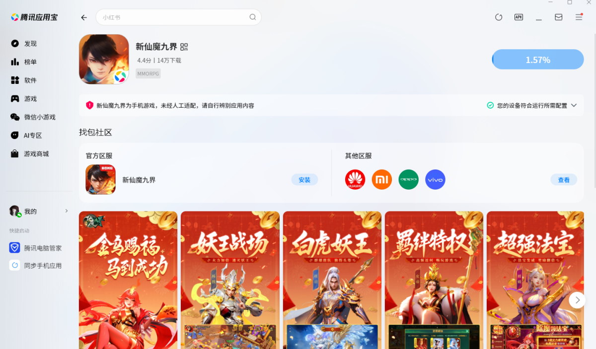 安装步骤如下: 1. 在天极下载站获取最新安装包; 2. 按提示安装应用宝电脑版(若已安装则自动调用); 3. 在应用宝中搜索并安装《新仙魔九界》; 4. 安装完成后,直接登录即可畅玩。