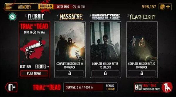 5、解锁游戏模式,游戏分为传统模式、大屠杀模式、极端模式和闪关灯模式;除传统模式外都需要完成任务来解锁。