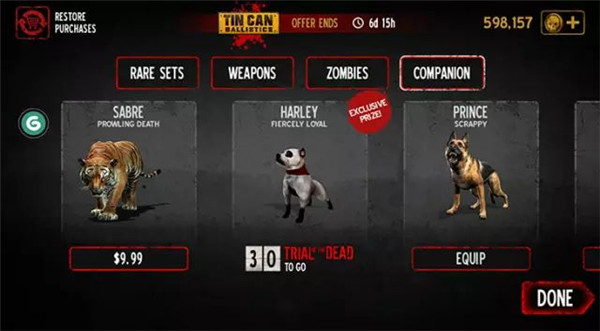 4、伙伴购买,这是一个比较有意思的系统;每隔一段时间会有一个你的宠物伙伴帮你干掉前面的僵尸,可以出现多个伙伴;包括有老虎、狼和狗等。