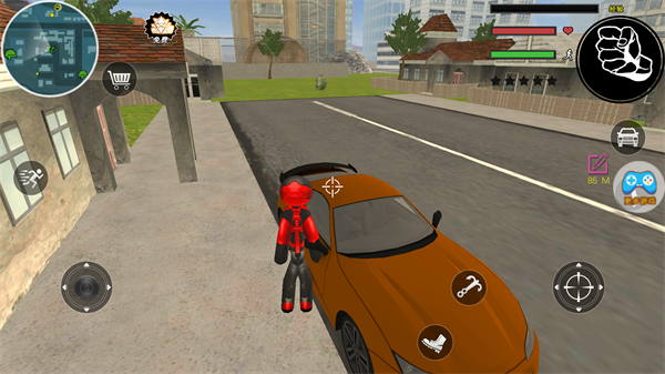 4、靠近地面车辆时,点击“超级脚”按钮即可将其踢飞,展现蜘蛛侠的强大力量。