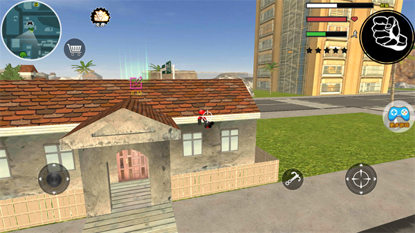 5、点击屏幕中的绳索按钮,即可发射蛛丝,实现飞檐走壁、高空滑翔等标志性动作。