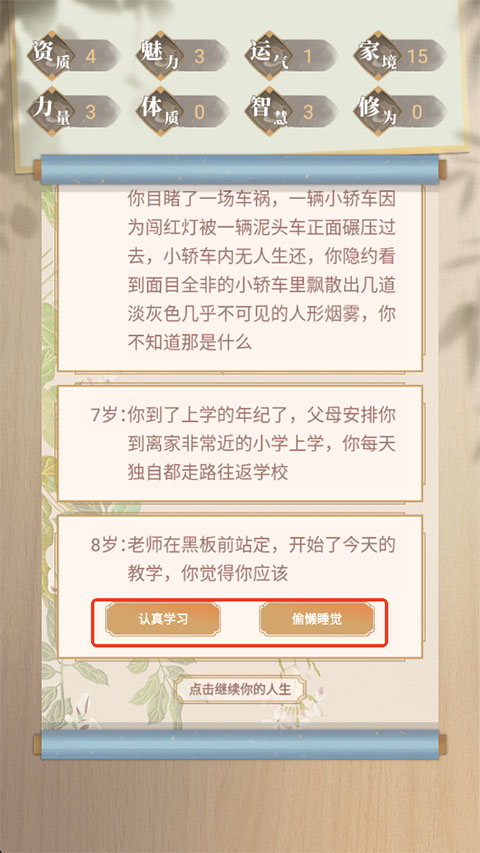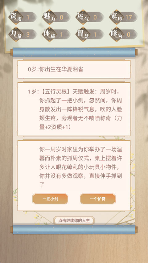 3、点击屏幕推进剧情,体验从平凡到超凡的人生旅程。