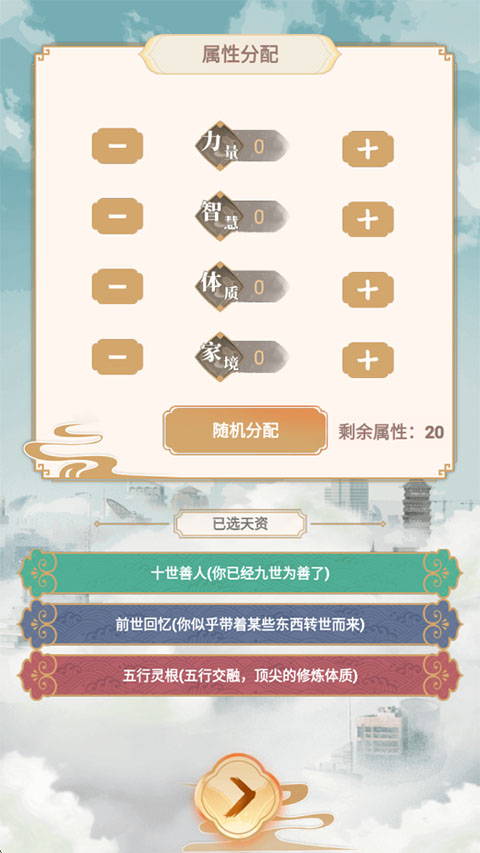 1、首次进入游戏后,从众多选项中精心挑选三项天赋,它们将伴随你度过此生,并影响后续发展路径。