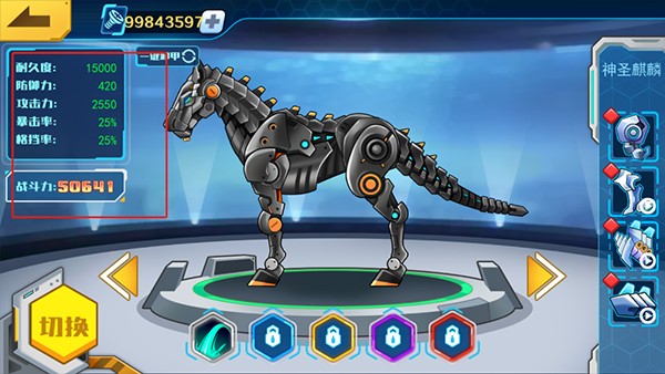在机甲仓库里可以查看机甲的所有属性以及战斗力。