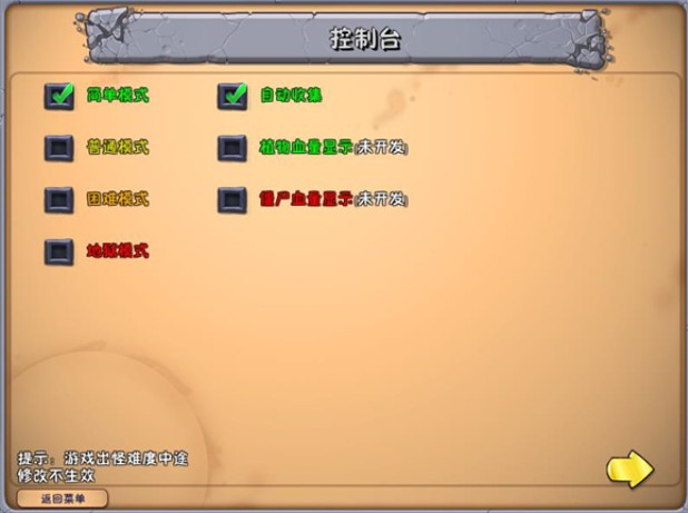 2、在控制台中,玩家可自由切换四种难度等级,并开启自动收集阳光功能,大幅提升操作便利性。