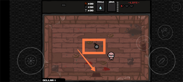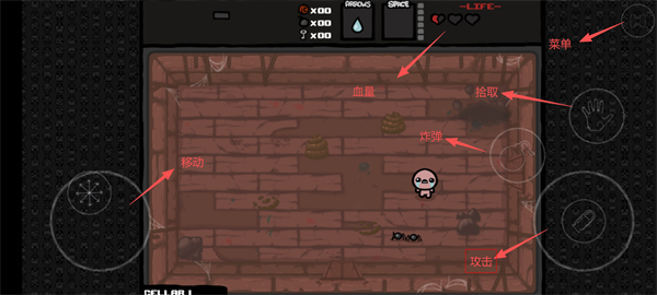 5、进入房间后会遭遇敌人,通过虚拟摇杆控制角色移动,并调整攻击方向发射“眼泪”进行战斗。注意灵活走位,避免与敌人接触,否则将损失生命值。