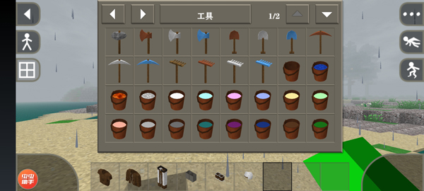 5、点击左侧“田”字图标打开背包,即可看到各类高效采集工具,如斧头、铁镐等,便于快速获取资源;