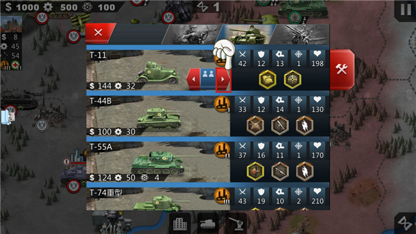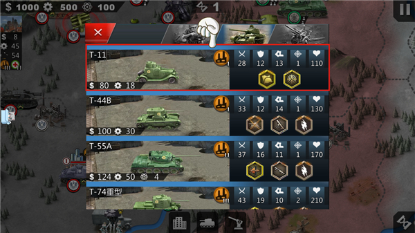7、不同建筑可生产对应兵种,造兵需消耗资源,点击底部坦克图标进入生产界面;