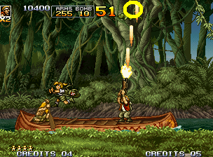 若顺利推进至最左侧,将遭遇一架直升机(击落后还会增援两架)从上方攻击,同时画面右侧也会陆续出现敌兵。