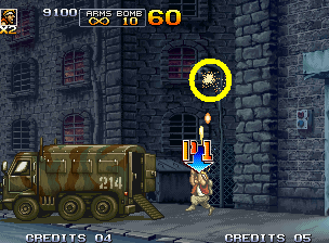 继续前进会遇到一辆载有敌兵的车辆,其中一名人质会提供“H”强化武器。