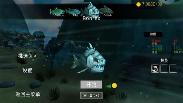 3、开放式的进化体系:以“吞噬—成长—进化”为核心循环,玩家从一条小鱼起步,通过吞食其他生物获取体型增长与进化点数。随着实力提升,不仅能自然变强,还可消耗金币解锁特殊物种(如魔化绿食人鱼),自由规划进化路线,最终登顶海洋食物链顶端。