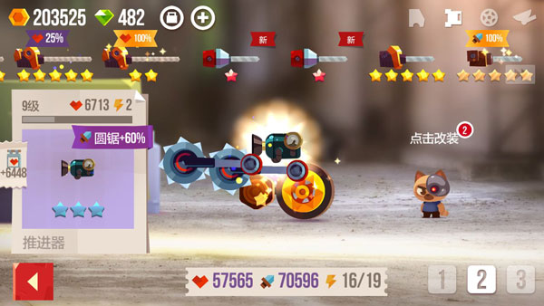 作为一款强调策略与创意的战车对战游戏,《喵星大作战》采用自动匹配机制,玩家只需点击“快速战斗”即可进入竞技场,系统会自动为你寻找对手展开对决。胜负不仅取决于火力压制,更考验战术布局——你可以用高伤武器直接清空敌方血条,也可以巧妙利用地形与结构设计,将对手掀翻后逼至墙角,借助地图中的电锯将其粉碎;甚至还能装配喷射装置,让战车飞跃敌人头顶,从背后发起致命打击。每一场战斗都充满变数,乐趣无穷!