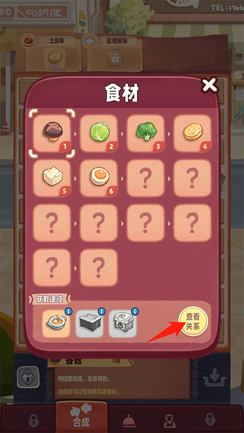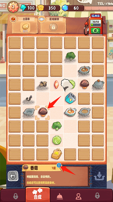 1、在合成界面,选中任意食材或厨具(以【香菇】为例),点击其旁的【蓝色】小图标,