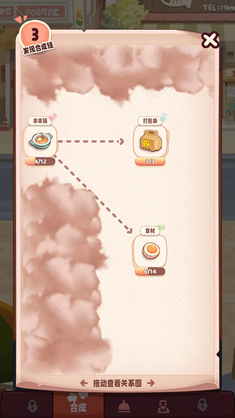 并未设置高门槛操作,而是采用体力限制结合合成消除的核心机制。从基础食材到锅碗瓢盆,所有资源皆可通过合成获取:先合成建材打造生产工具,再消耗体力点击工具产出料理原料;已获得的工具与原料还能通过“二合一”方式升级为更高级素材。玩家只需专注完成顾客订单,享受轻松又富有策略的合成乐趣。