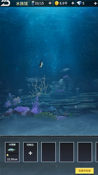6、你可以选择直接出售,转化金币入账,也可以采取“放长线钓大鱼”的思路,先“放入”水族馆养一段时间再卖,鱼在放入水族箱后会不断成长,卖出时获得的金币也会更高哦~