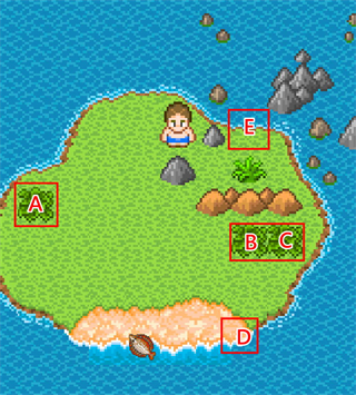 本岛BC区峭壁上方有个峭壁平台,但得先挖开黑色土堆才能架设「坚固的绳子」爬上去,这个黑色小土堆用「铁铲子」得挖37下左右,中土推得挖76下左右,最好是先制作好「钢铲子」后再来挖,钢铲子所需的材料(铁棒、金属线、螺丝)可透过溪钓取得。