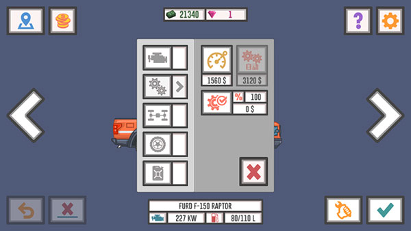 4、在这里可对引擎动力、轮胎抓地力、油耗效率等关键属性进行优化。改装过程需要一定时间,也可使用金币加速完成。