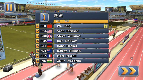 2、进入比赛界面后,系统将展示参赛选手名单,他们来自世界各地。接下来将详解跳远操作流程。