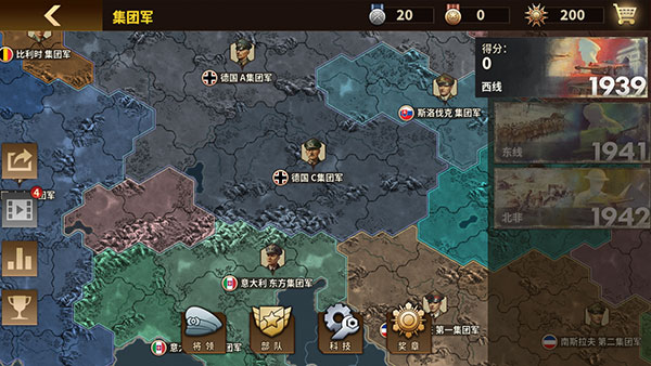 1、部署国家专属集团军,搭配独特科技卡牌,加速全球征服进程。