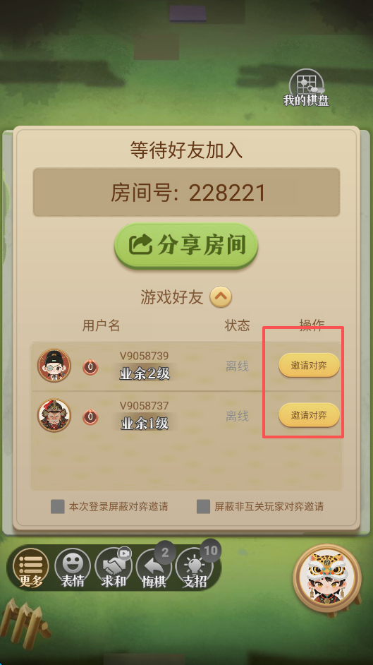 10、选择目标好友,点击“邀请对弈”,待对方接受后,双方立即进入实时对局。