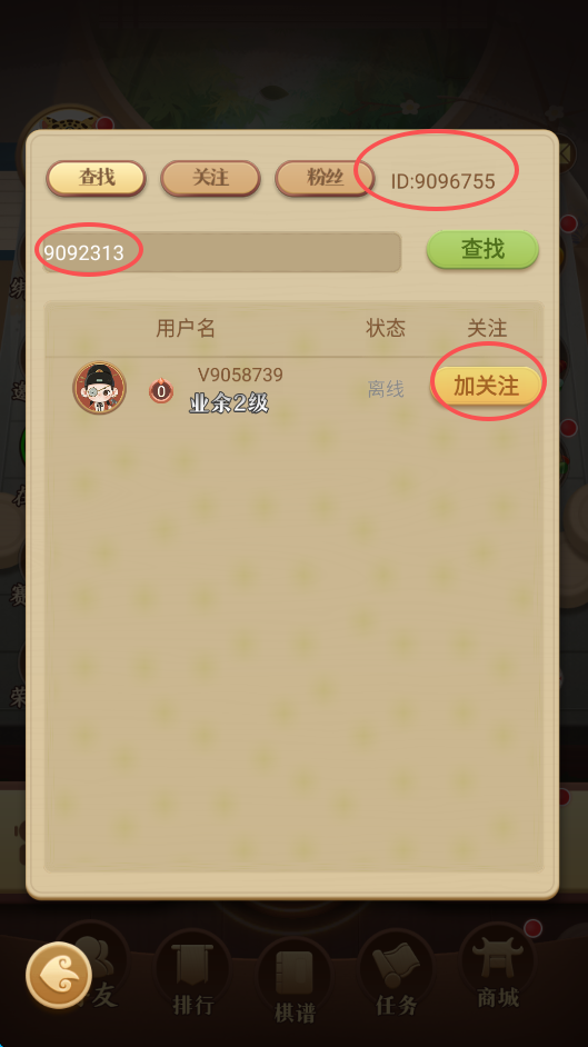 8、每位用户拥有唯一ID(显示于屏幕右上角),在搜索框中输入好友ID并点击“查找”,关注后即完成好友绑定。