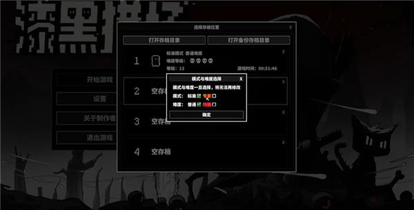 1、进入漆黑猎场游戏,开始游戏并选择一个存档位置,根据需求选择模式与难度。
