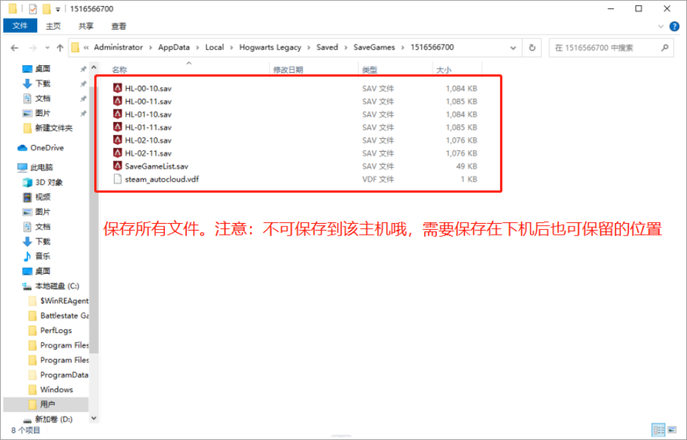 C盘 → 用户目录 → AppData → Local → Hogwarts Legacy → Saved → save