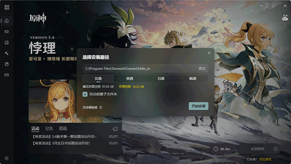 4、首次使用需完成安装流程:指定游戏安装目录、选择语言版本,确认后开始部署;安装完毕即可直接启动游戏,全程无需跳转至官方平台。