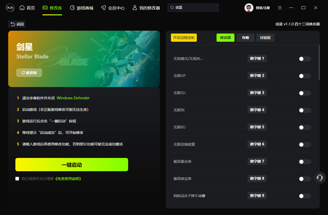 7、先启动目标游戏,待游戏进入主界面后,返回修改器点击“一键启动”,提示成功后即可启用各项功能;