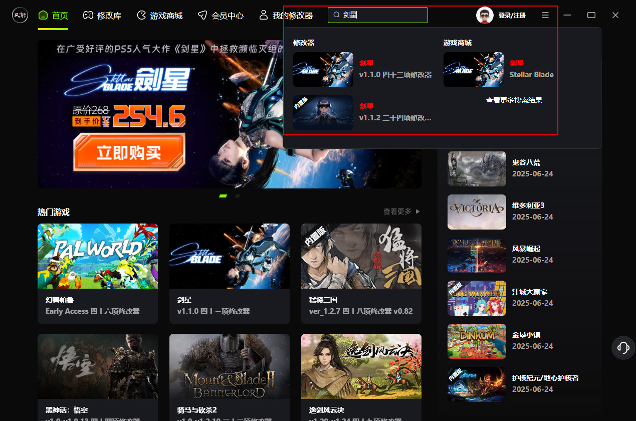 5、在左上方搜索栏输入目标游戏名称(如“剑星”),系统将即时列出匹配结果;