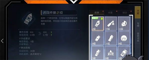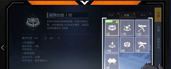 常规技能划分为投掷技能、装置技能与被动技能三类,覆盖战场控制、持续作战与属性强化等核心维度:
