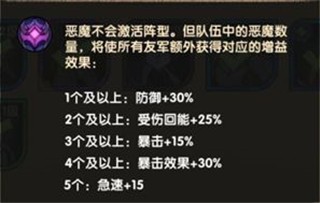 而当队伍中包含恶魔英雄时,将激活特殊加成,大幅提升小队的防御力、受伤回能效率、暴击率与急速属性,形成爆发型战斗风格。